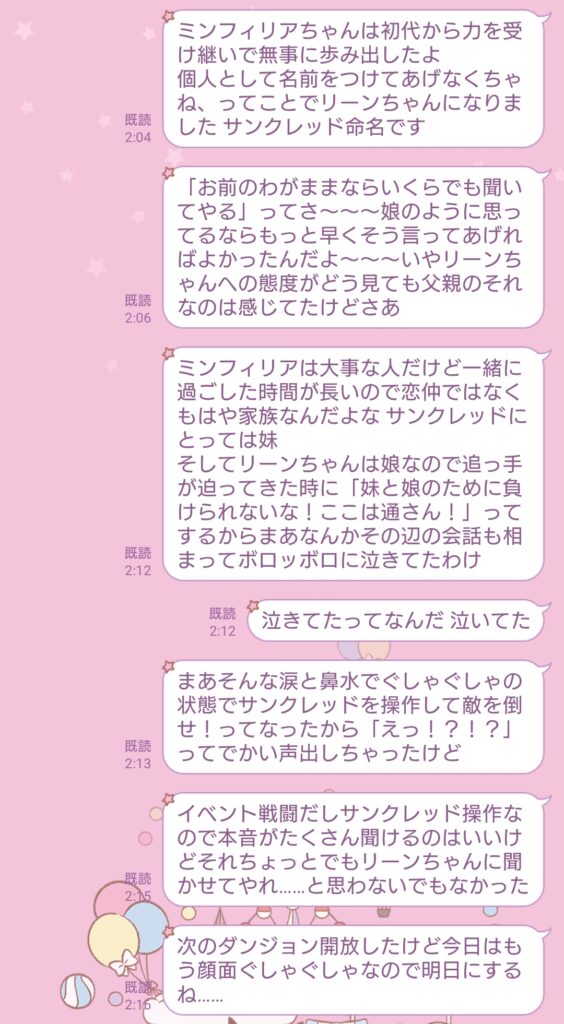 これは泣きながら妹のLINEに壁打ちしてたやつ 妹はFF14知らないので説明も入ってるけども